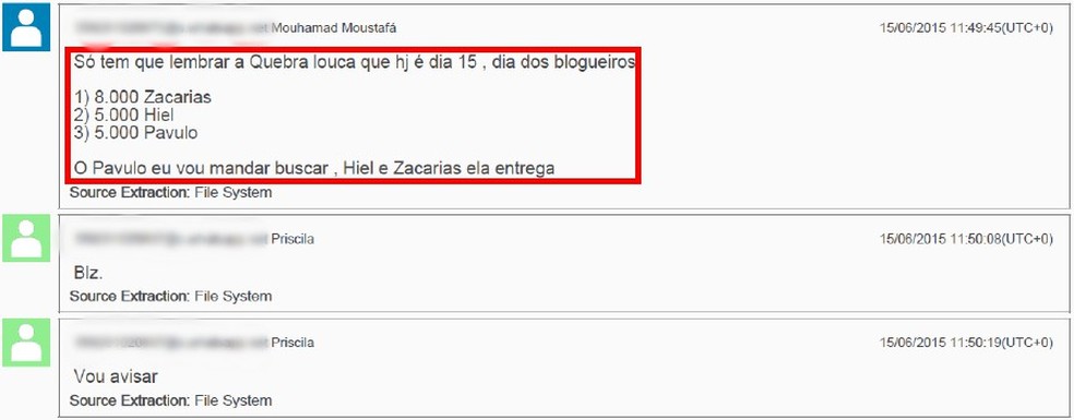 A Polícia Federal analisou a primeira conversa, ocorrida em dezembro de 2014, e que indicava os pagamentos. Naquele mês, Mouhamad enviou para Priscila um "print" de uma conversa em que Zacarias cobra do médico o "compromisso" do dia 15, tratado por Mouhamad como o "dia do vencimento".