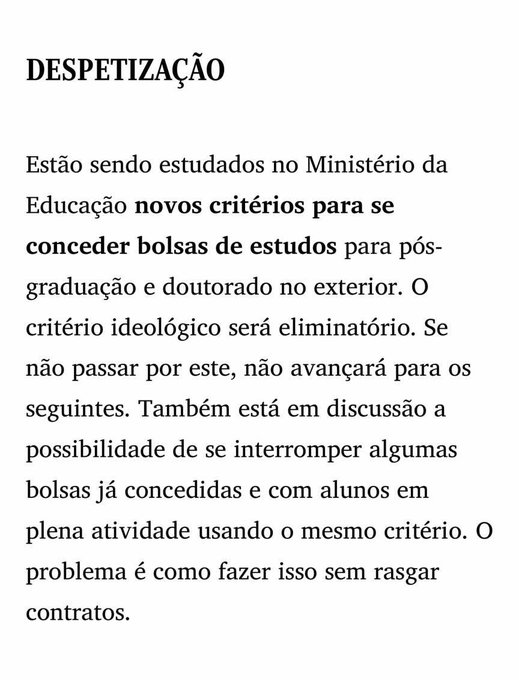 A usina de ilegalidades e absurdos do governo Bolsonaro não para. Agora inventaram um critério “ideológico” para concessão de bolsas. Os çábios bolsonaristas têm que consultar o Art. 5 IX da Constituição. O que eles chama de despetização é a velha censura à pesquisa científica.