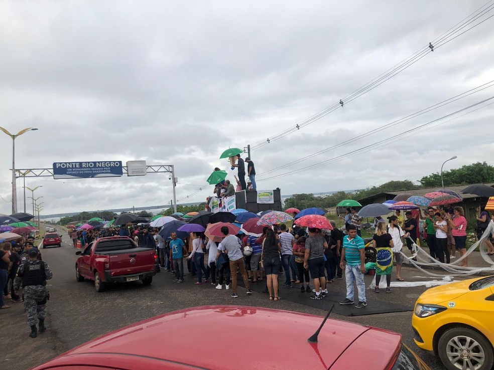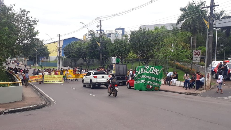Em greve há uma semana, professores fizeram protestos na manhã desta segunda-feira (22) na Ponte Phelippe Daou e em frente à sede do Governo do Amazonas, ambos na Zona Oeste de Manaus. A categoria cobra reajuste salarial de 15%. A Secretaria de Educação ofereceu, até então, contraproposta de 3,89%.